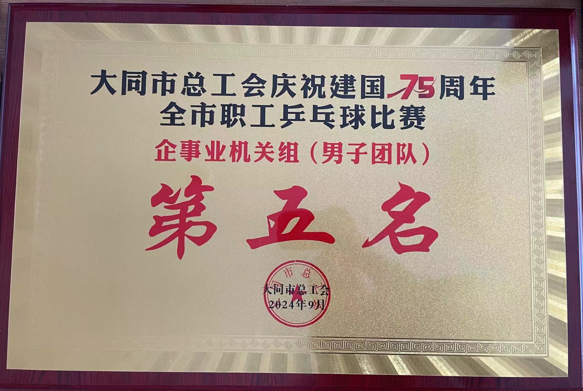2024年9月,大同市總工會授予集團公司企事業機關組(男子團隊)“大同市總工會慶祝建國75周年全市職工乒乓球比賽”第五名。